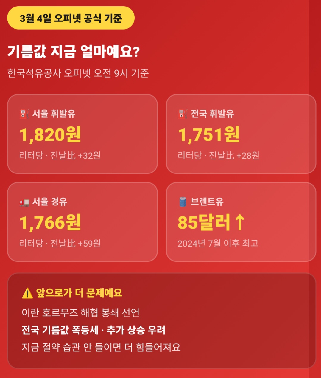 3월 3일 오피넷 기준 서울 휘발유 평균 가격이 리터당 1,771원까지 올랐어요. 지난달 28일(1,750원)보다 불과 며칠 만에 22원 뛰었어요. (Tossbank)