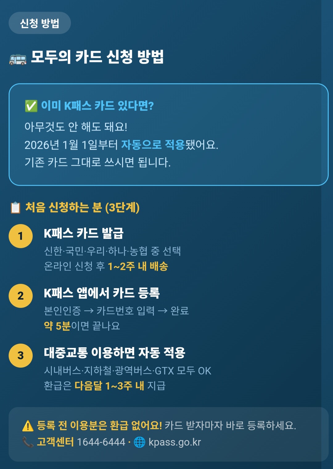 중요한 것 하나. 카드를 발급받자마자 바로 등록해야 해요. 등록 전에 사용한 교통비는 환급 대상에 포함되지 않아요.