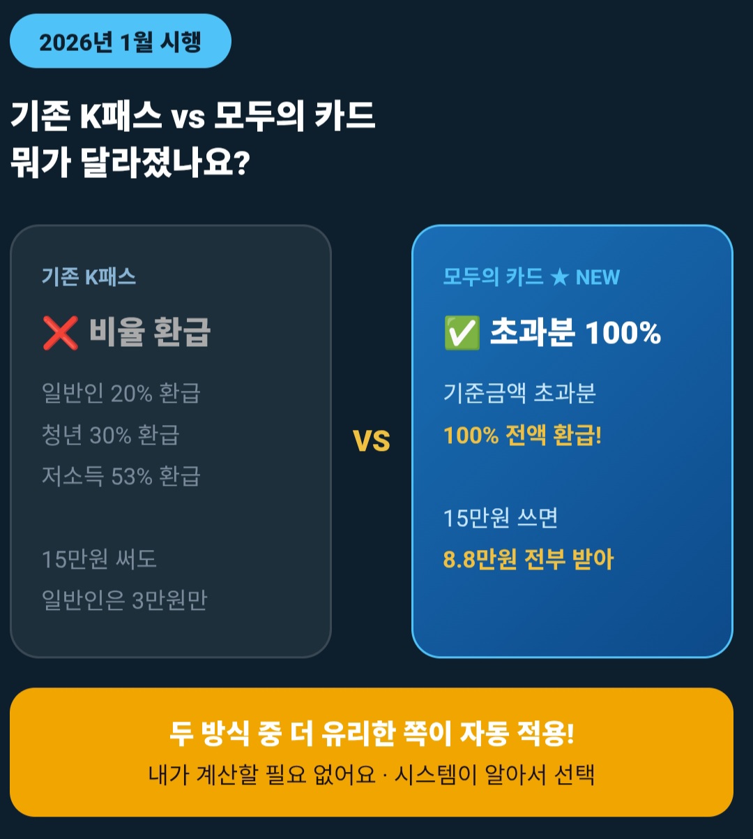 2026년 1월 1일부터 자동으로 적용됐어요. 지금 쓰는 K패스 카드 그대로 사용하면 시스템이 알아서 K패스 비율 환급과 모두의 카드 초과분 환급 중 더 유리한 방식을 골라서 적용해줘요.