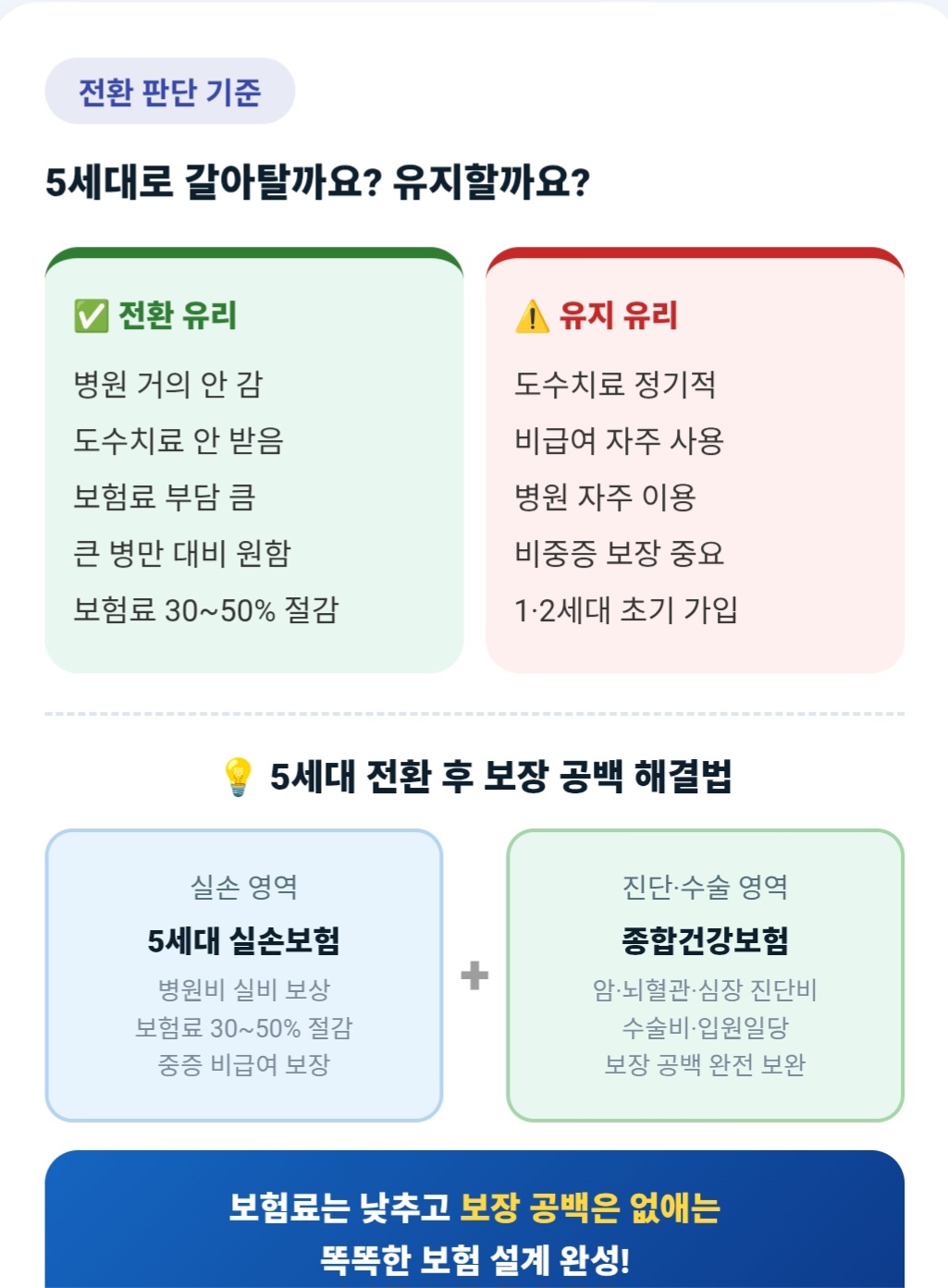 이 다섯 가지를 먼저 파악하면 5세대 전환 여부와 종합건강보험 보완 필요성을 스스로 판단할 수 있어요.